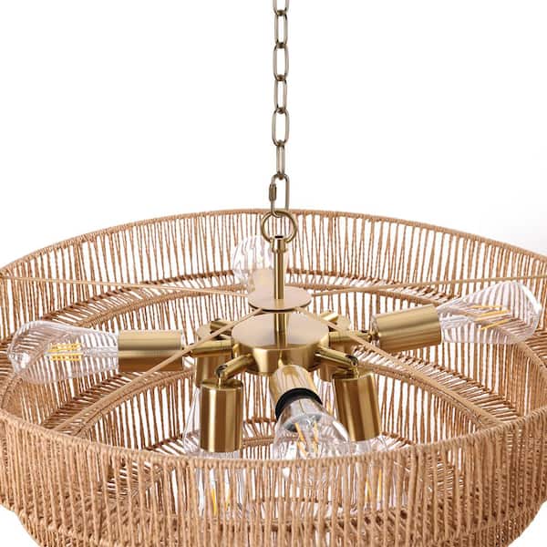 25.6 in. 8-Light 5-Tier Gold Hand-Woven Rattan Chandelier with Closed Weave Shade