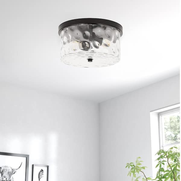 9.8 in. 2-Light Black Flush Mount Ceiling Light with Clear Hammered Glass