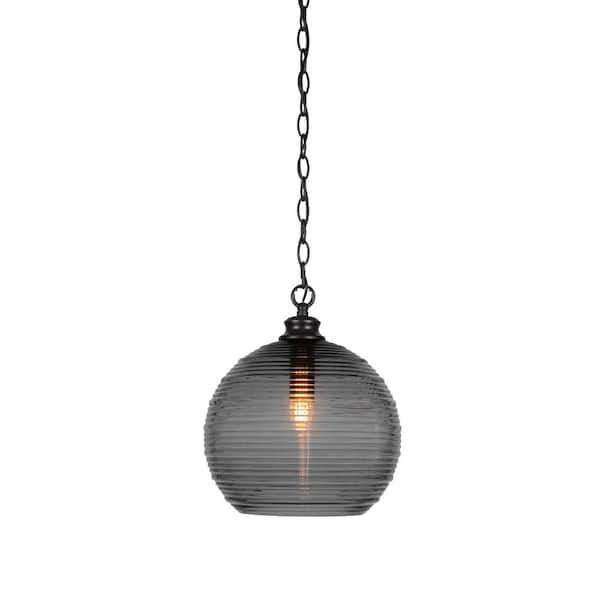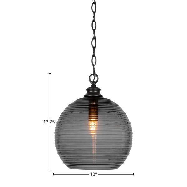 Langdale 60-Watt 1-Light Matte Black Shaded Pendant Light with 12 in. Smoke Ribbed Glass Shade, No Bulb Included