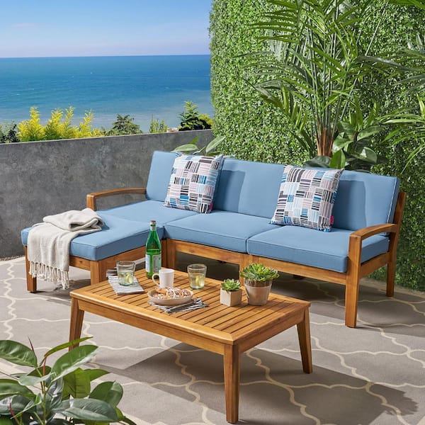 Large L-Shaped Wood Outdoor Sofa with Blue Cushions - Premium Comfortable Sectional Couch, Modern and Stylish