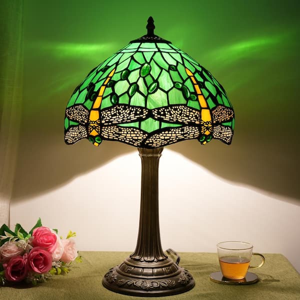 19 in. Tiffany Style Bronze Finish Table Lamp with Green Dragonfly Stained Glass Lamp Shade