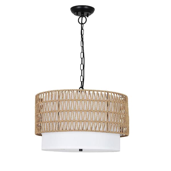 Boho 19 in. 5-Light Beige Pendant Light Chandelier with Rattan and Fabric Shade