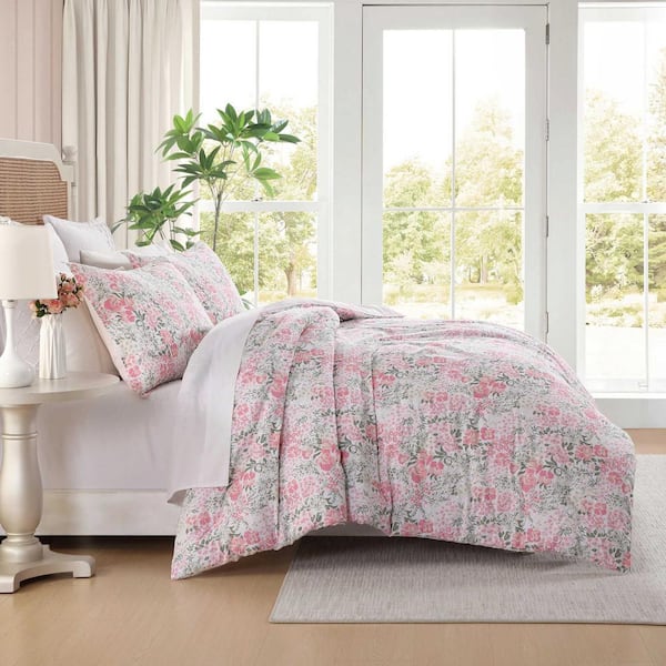 Heather Garden 3 Piece White/Pink/Green 100% Cotton King Comforter Set
