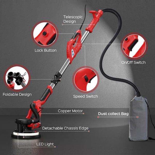 5.5 ft. Red Drywall Sander with Vacuum Dust Collector, 7 Variable Speed 800-1800 RPM, Extendable Handle, LED Light