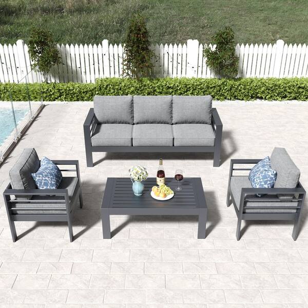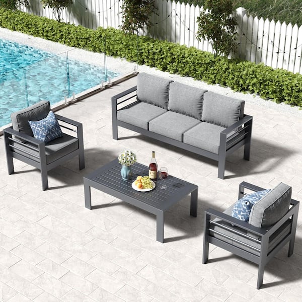 4-Piece Aluminum Patio Conversation Set with 2 Armrest Chairs, 3-Seater Sofa and Coffee Table