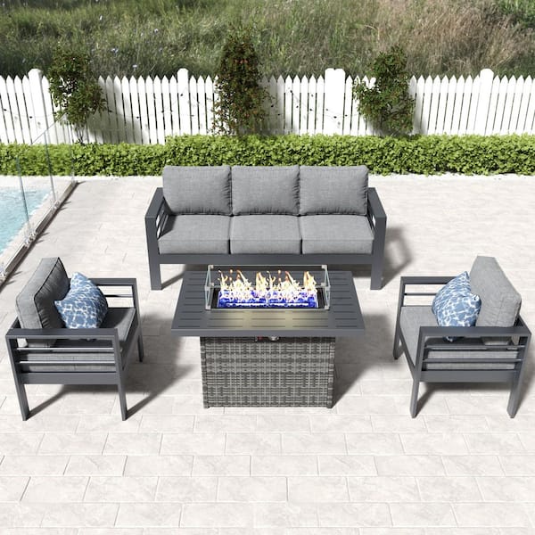 4-Piece Aluminum Patio Conversation Set with Propane Gas Rectangular Fire Pit Table and Gray Cushion
