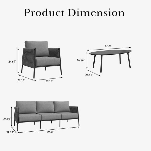 4-Piece Modern Woven Rope Outdoor Furniture Set with Oval Table and Gray Cushions
