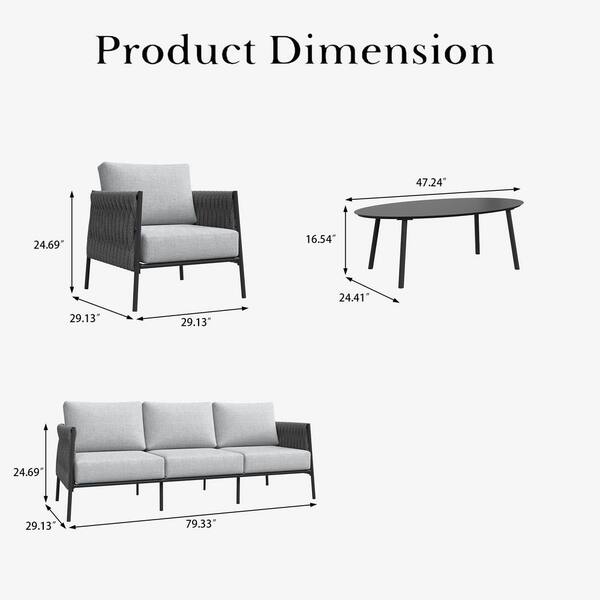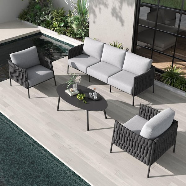 4-Piece Modern Woven Rope Outdoor Furniture Set with Oval Table and Light Gray Cushions