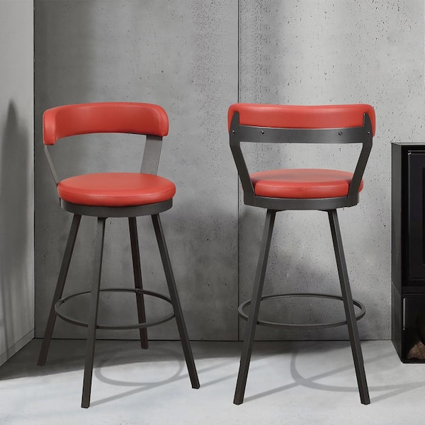 Avignon 30 in. Dark Gray Metal Swivel Pub Height Chair with Red Faux Leather Seat (Set of 2)
