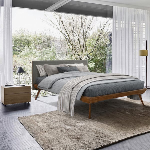 • Gray fabric headboard adds a chic contrast to chestnut finish.