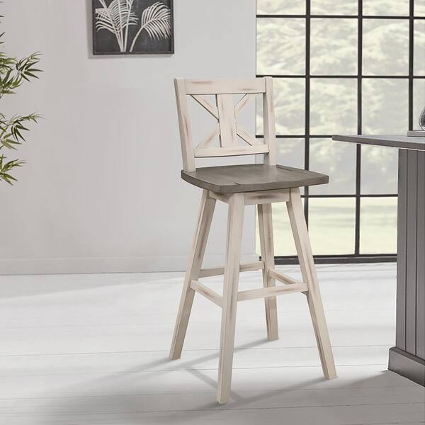 Fenton 28 in. Distressed Gray and White Wood Swivel Pub Height Chair (X-Back) with Wood Seat (Set of 2)