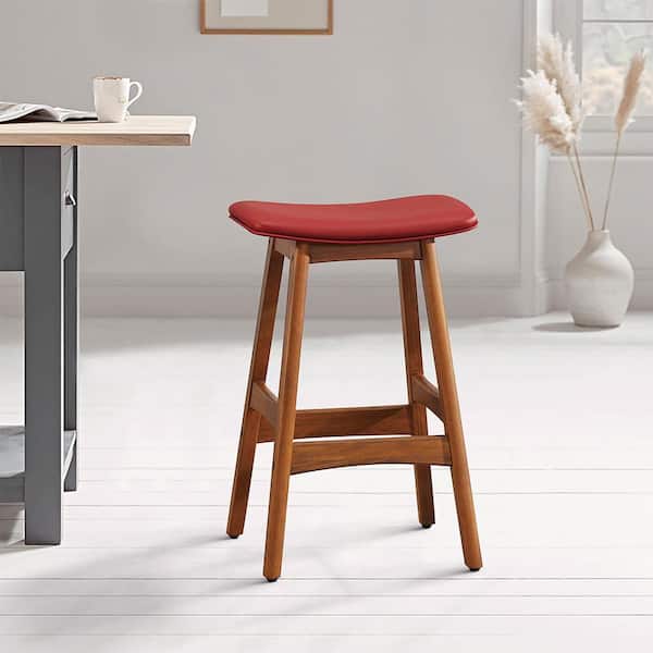 Lillie 25.5 in. Walnut Finish Wood Counter Height Stool with Matt Red Faux Leather Seat (Set of 2)