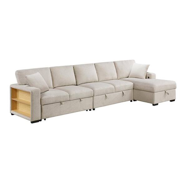 Pegosa 144.5 in. Straight Arm 3-Piece Boucle Fabric Sectional Sofa in Beige with Right Chaise, Pull-Out Bed