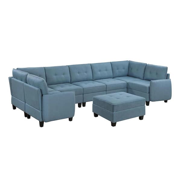 Swallowtail 138 in. Pillow Top Arm 8-Piece Fabric Sectional Sofa with Storage and Ottoman in Blue