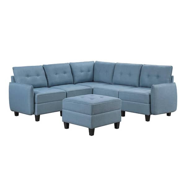 Swallowtail 86 in. Pillow Top Arm 6-Piece Fabric Sectional Sofa with Storage and Ottoman in Blue