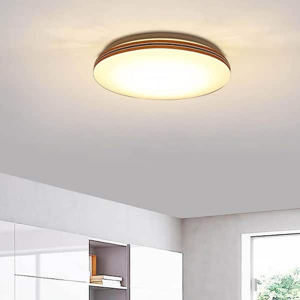 11.5 in. Round White with Faux Wood-Grain Trim Adjustable CCT 3000K/4000K/5000K Dimmable Flush Mount Light Fixture