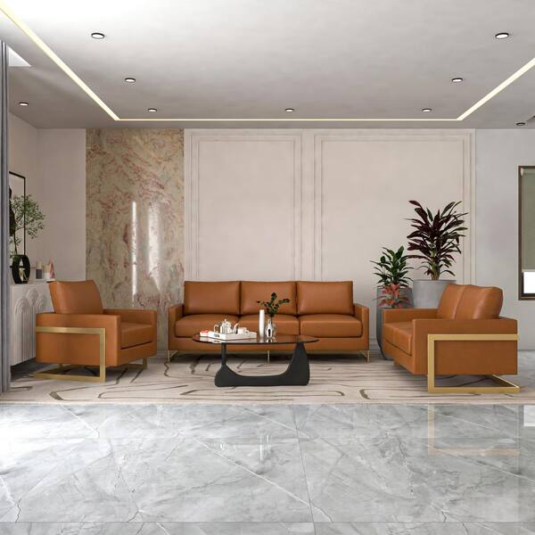 3-Piece Sofa Set Upholstered in Leather with Gold Stainless Steel Base and Removable Cushions in Cognac Tan