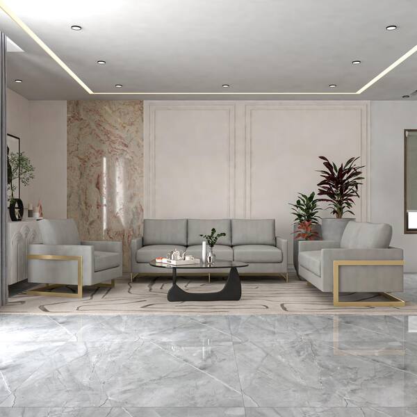 3-Piece Sofa Set Upholstered in Velvet with Gold Stainless Steel Base and Removable Cushions in Light Grey