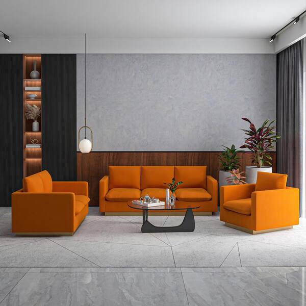 3-Piece Sofa Set Upholstered in Velvet with Gold Stainless Steel Base and Removable Cushions in Orange Marmalade