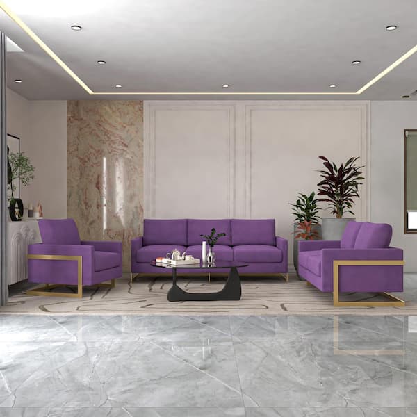 3-Piece Sofa Set Upholstered in Velvet with Gold Stainless Steel Base and Removable Cushions in Purple