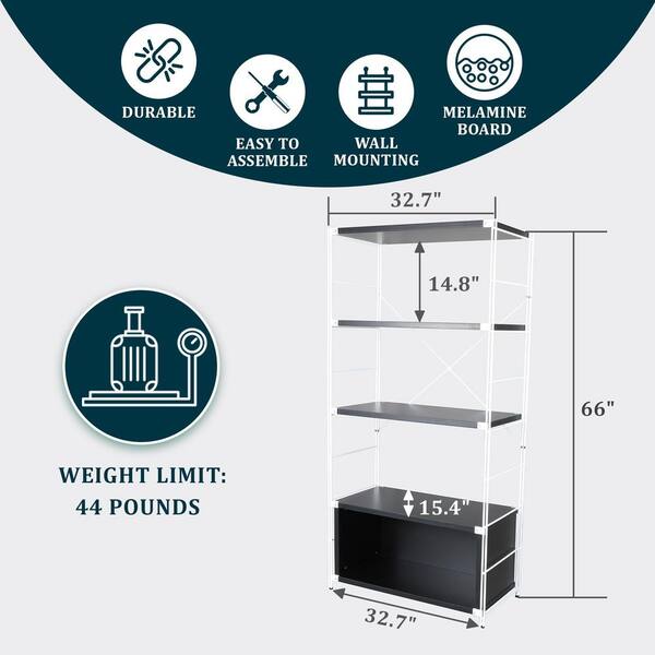 Brentwood Etagere 4 Shelves Modern Bookcase with White Stainless Steel Frame and Melamine Board Shelves in Black
