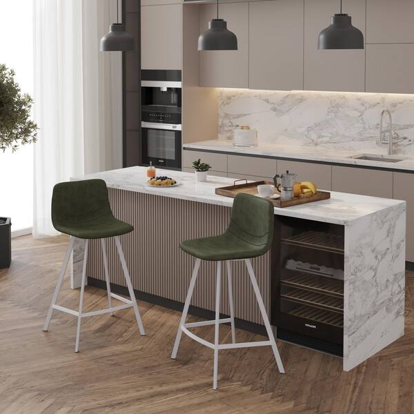Elland 35 in. Leather Upholstery Counter Bar Stool in Black Stainless Steel for Indoor and Outdoor in Olive Green