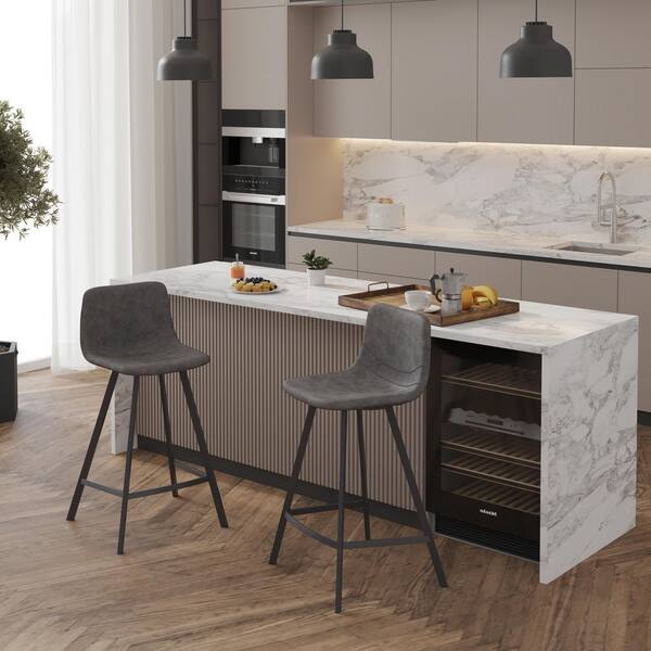 Elland 35 in. Leather Upholstery Counter Stool in Black Stainless Steel for Indoor and Outdoor in Grey