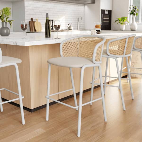 Ervilla Modern Wicker Bar Stool with Fabric Seat and White Powder Coated Steel Frame, Set of 2 (Beige)
