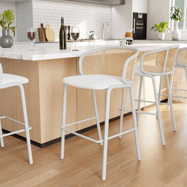 Ervilla Modern Wicker Bar Stool with Fabric Seat and White Powder Coated Steel Frame, Set of 2 (White)