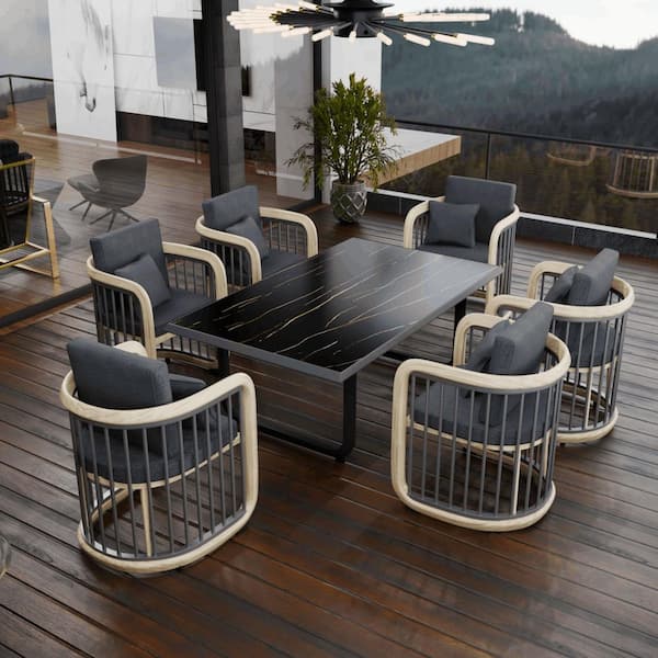 Klyra 7-Piece Aluminum Rectangular Outdoor Dining Set with Gray Olefin Cushions 6 Armchairs and Dining Table