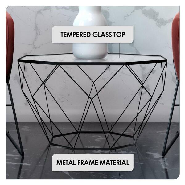 Malibu 22 in. Octagon Coffee Table Modern Tempered Glass Tabletop Geometric Metal Frame Accent Table in Black