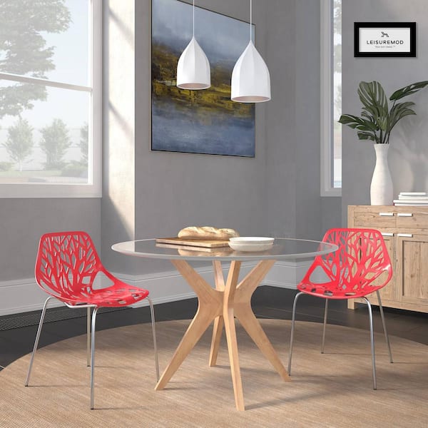Stackable Dining Chair in Polypropylene Plastic with Chrome Metal Legs Set of 2 Modern Cut-Out Design Backrest in Red