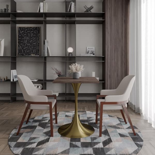 Verve 24 in. Wide Square Dining Table MDF Wood Tabletop and Brushed Gold Stainless Steel Pedestal Base in Dark Maple