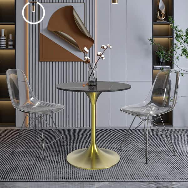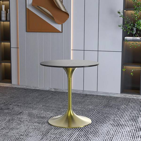 Verve Round Dining Table 27 in. Sintered Stone Tabletop in Brushed Gold Stainless Steel Pedestal Base Seats 2 in Black
