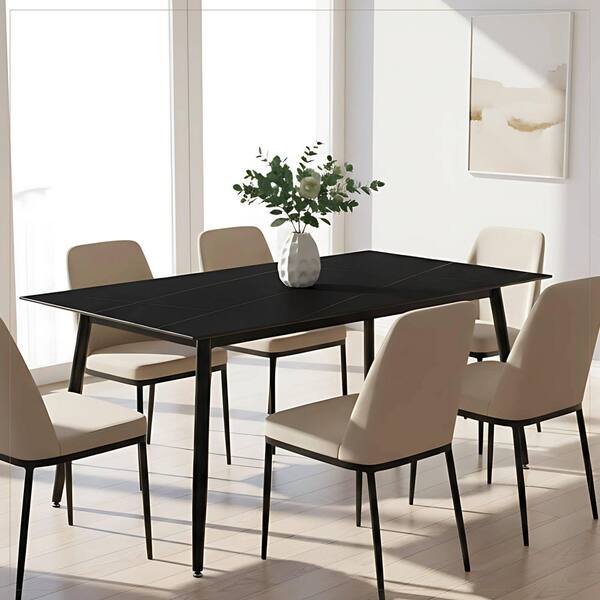 Zayle Dining Table with a 55 in. Sintered Stone Rectangular Tabletop and 4 Legs Black Steel Base in Black/Gold Seats 4