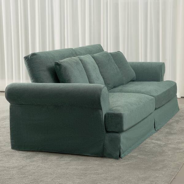 102 in. Wide Lazy Style Round Arm Cotton and Linen Fabric Removable Covers Rectangle 2-Seater Sofa in Green