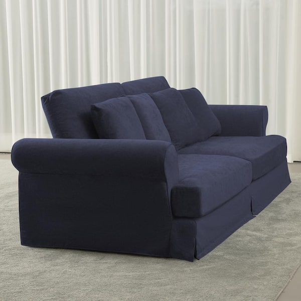 102 in. Wide Lazy Style Round Arm Cotton and Linen Fabric Removable Covers Rectangle 2-Seater Sofa in Navy Blue