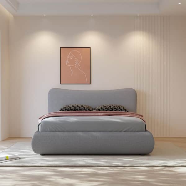 Gray Solid Pinus Wood Frame Queen Size Low Profile Platform Panel Bed with Lambswool Inward Concave Headboard and Sides