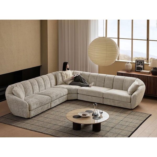 Modern 126 in. Wide Slope Arm Chenille Fabric L-Shaped (V-Shaped) Sectional Sofa Scallop Sofa 5 Seats in Light Brown