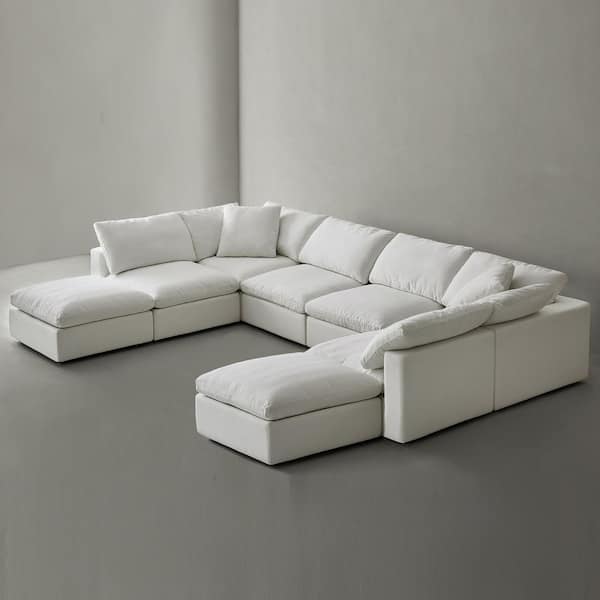 Modern 157 in. Wide Square Arm Linen Fabric U-Shaped Sectional Sofa Combination 6 Seats with Two Ottomans in Pearl White