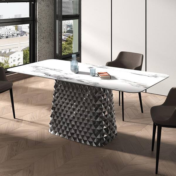 Modern Rectangle Jade White Patek Philippe Stone Top 55.12" Stainless Steel Ripple Mirror Pedestal Dining Table (4Seats)