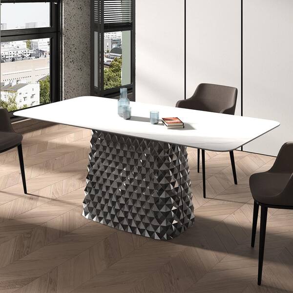 Modern Rectangle White Snow Mountain Stone Tabletop 55.12" Stainless Steel Ripple Mirror Pedestal Dining Table (4 Seats)