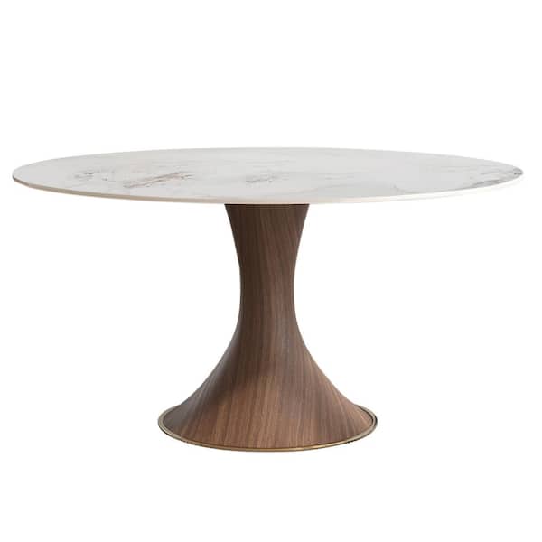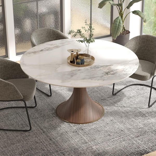 Modern Round White Chanel Rock Stone Tabletop 53.15 in. Black Woodgrain Pedestal Dining Table (Seats-4)