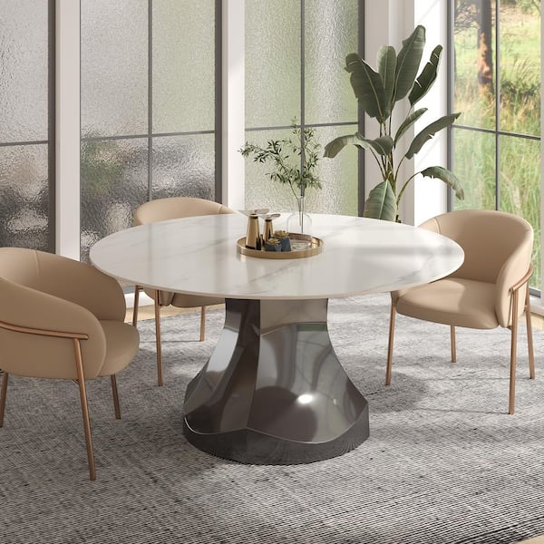 Modern Round White Snow Mountain Stone Tabletop 53.15 in. Gunmetal Grey Stainless Steel Pedestal Dining Table (4 Seats)