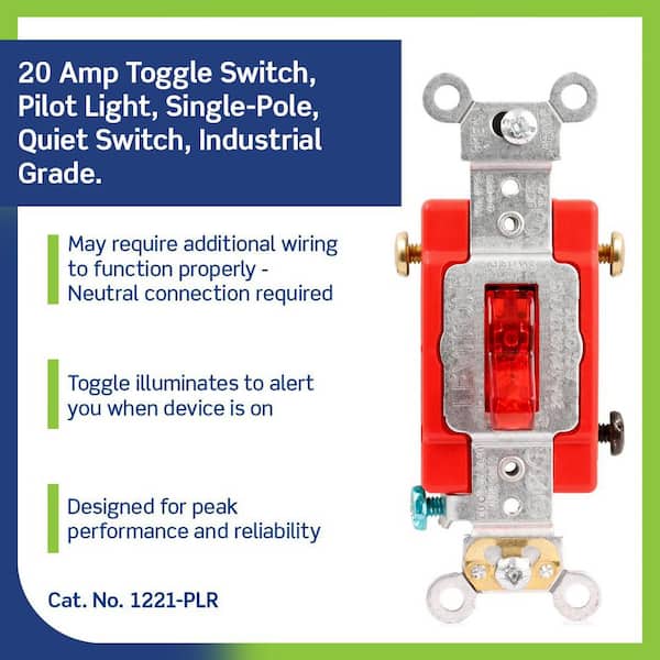 20 Amp Industrial Grade Heavy Duty Single-Pole Pilot Light Toggle Switch, Red 1221-PLR