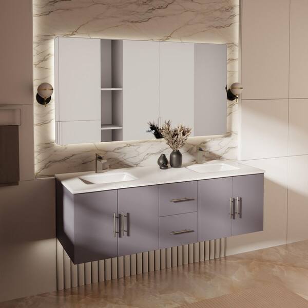Geneva 60 in. W x 22 in. D Dark Grey Double Bath Vanity, White Quartz Top, and Faucet Set
