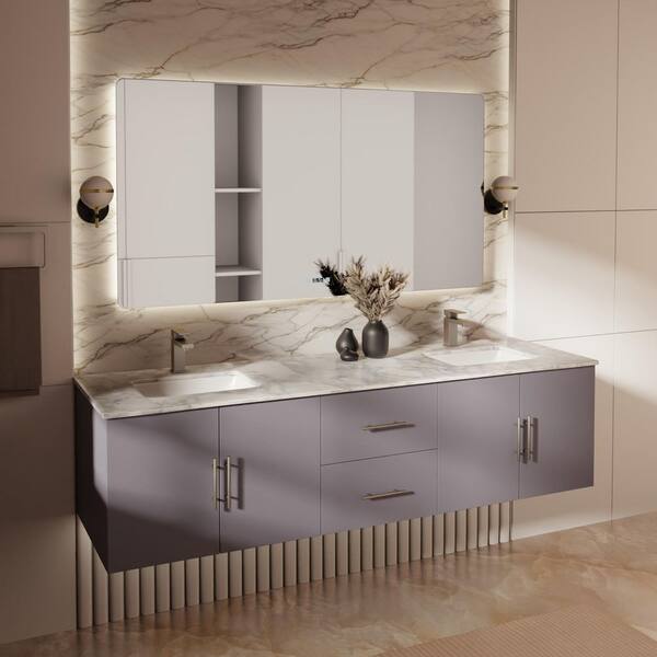 Geneva 72 in. W x 22 in. D Dark Grey Double Bath Vanity, Carrara Marble Top and 30 in. LED Mirrors