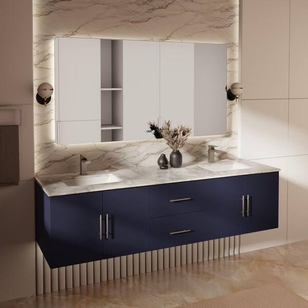 Geneva 72 in. W x 22 in. D Navy Blue Double Bath Vanity and Carrara Marble Top