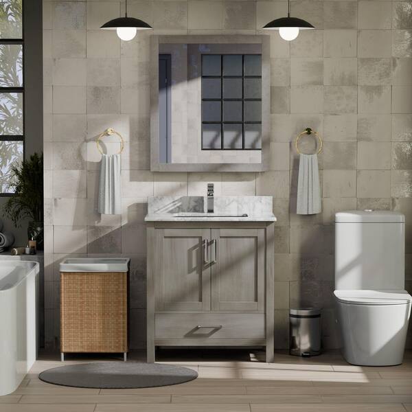 Jacques 30 in. W x 22 in. D Distressed Grey Bath Vanity, Carrara Marble Topand 28 in. Mirror