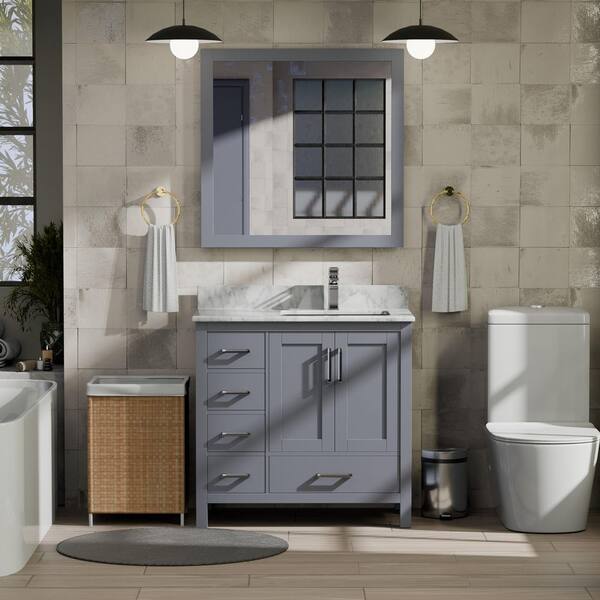 Jacques 36 in. W x 22 in. D Right Offset Dark Grey Bath Vanity, Carrara Marble Top, Faucet Set, and 34 in. Mirror